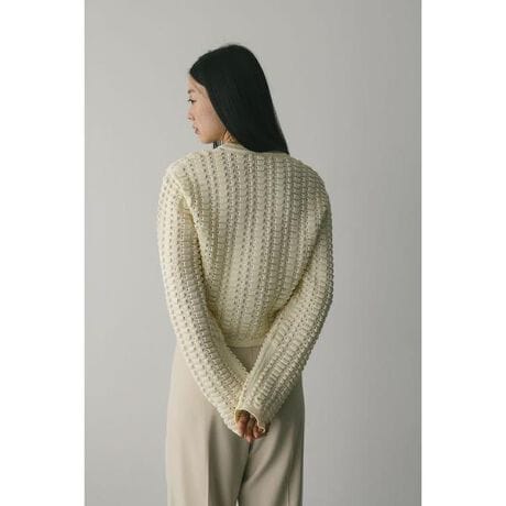 WHT,BLK:モデル身長172cm(FREEサイズ着用)BLU:モデル身長168cm(FREEサイズ着用)表面に凹凸のある編地が特徴的なニットトップ。立体的な編み柄がシンプルなスタイリングに奥行きを与え、1枚で存在感を発揮します。甘さを抑えた表情で、カジュアルにもモードにも合わせやすいアイテム。程よい厚みでロングシーズン着用でき、デイリーの着こなしにアクセントを添えてくれます。ストレッチあり、透け感なし。【お手入れ方法】手洗い可