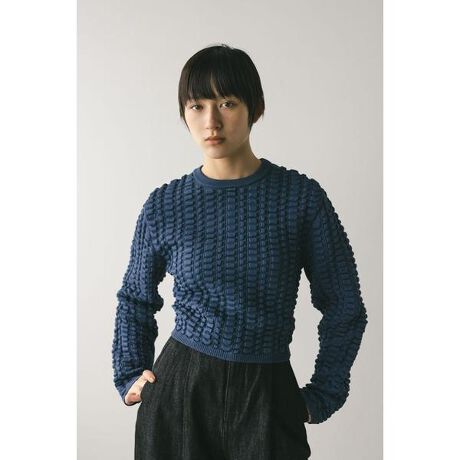 [型番:500JSR70-1221]WHT,BLK:モデル身長172cm(FREEサイズ着用)BLU:モデル身長168cm(FREEサイズ着用)表面に凹凸のある編地が特徴的なニットトップ。立体的な編み柄がシンプルなスタイリングに奥行きを与え、1枚で存在感を発揮します。甘さを抑えた表情で、カジュアルにもモードにも合わせやすいアイテム。程よい厚みでロングシーズン着用でき、デイリーの着こなしにアクセントを添えてくれます。ストレッチあり、透け感なし。【お手入れ方法】手洗い可