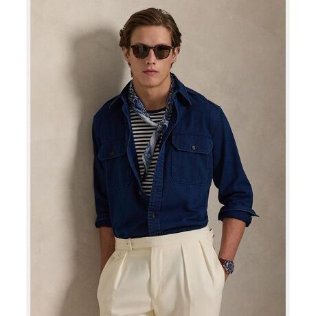 1940年代の米国のサープラススタイルにインスパイアされたコットン チノ ワークシャツ。インディゴ染めを施し、特別なウォッシュ加工でヴィンテージ感を演出。・クラシックフィット:胸、ウエスト、袖にかけてゆったりとしたカット、低いアームホール・ストレートカラー / ボタン付き前立て / コロゾボタン・長袖、ボタン付きショルダーエポーレット / ボタン付きバレルカフス・胸にボタン付きポケット2つ・インディゴ染めを施したアイテムのため、他の生地、レザー、布張りの室内装飾品に色移りすることがあります。・モデル身長185cm、着用サイズM※商品の色味は、光のあたり具合など諸条件により色感が多少異なって見える場合がございますので予めご了承下さい。※ラルフ ローレンのシャツは、袖口がまくられた状態で納品され、そのままの状態で保管されている場合があります。デザインや商品特性を活かす為に、あえてこのような工夫をしておりますので、予めご了承ください。 【素材】・本体:綿 100%【生産国】ベトナム