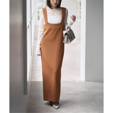 バスト位置から少し下の絶妙な位置でスカートに切り替えた脚長効果も狙える美シルエットのジャンパースカート風ワンピース。