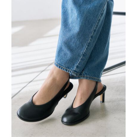 モードな印象のオブリークトゥで洗練されたシルエットのスリングバックパンプス。