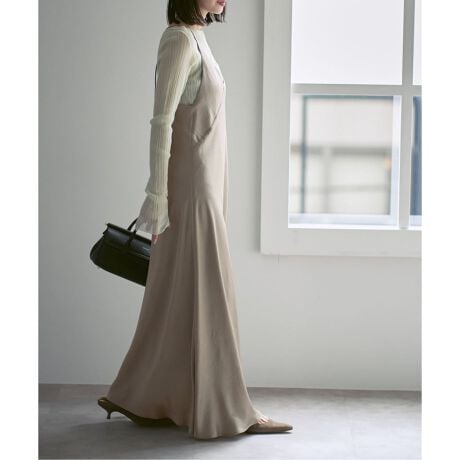 エレガントなフロントと長めの紐が垂れたアクセントのあるバックスタイルで360°どこから見ても可愛いキャミワンピースは、シアーニットやカットソーなどと重ねたり、ジャケットインに着用したりと様々なスタイリングを楽しめる汎用性の高さも高ポイントです◎。