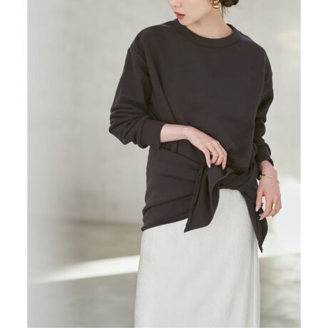 スウェットは身体から離れるシルエットながらボリュームが出すぎず、女性らしく纏えるのがポイントです。