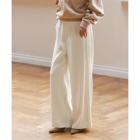 スポーティーな印象のラインパンツを、同素材のピンタックでサイドラインを表現したことで女性らしく仕上げた一品。