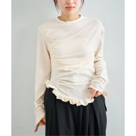 アシンメトリーなシャーリングとフリルが目を引く、個性的なロングスリーブTシャツ。