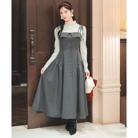 ギャザー切り替えが大人可愛いきれいめなキャミワンピース【Design】・インナー次第でいろんなコーディネートで着回しできるキャミワンピース。・ギャザー切り替えでふんわりとしたシルエットに。・背中部分は伸縮性のあるシャーリング仕様になっており、後ろのリボンでウエストサイズを調整できます!・ショルダーはアジャスター付きで、長さ調整が可能です。・左脇ファスナー仕様。【Fabic】・上品な質感のある生地を使用。・程よいハリ感のある裏地付き。・ピンク、モカ、チャコールグレー、ブラックの4色展開となります。【Care】ドライクリーニング