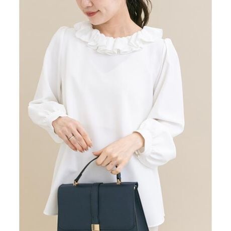 コサージュのような大ぶりフリルを衿周りに贅沢にあしらった、デザインブラウス。程よく開いたボートネックが抜け感を添え、顔周りを華やかに演出します。前後2WAY仕様なのも嬉しいポイントで、開きを前にすればスキッパー仕様で自然なカジュアルさも楽しめます。