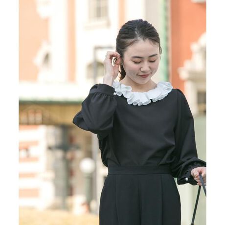 コサージュのような大ぶりフリルを衿周りに贅沢にあしらった、デザインブラウス。程よく開いたボートネックが抜け感を添え、顔周りを華やかに演出します。前後2WAY仕様なのも嬉しいポイントで、開きを前にすればスキッパー仕様で自然なカジュアルさも楽しめます。