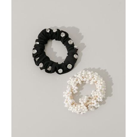 キラキラと輝くビジューをあしらった黒のシュシュ風ゴムと、たっぷりのパールをデザインしたヘアゴムのセット。