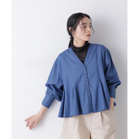 レイヤードを楽しめるVネック前開き仕様のデニムブラウス。ウエスト位置から広がるペプラムシルエットがすっきりとした印象に導き、さりげなくスタイルアップ効果を発揮してくれるアイテムです。
