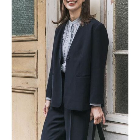 ノーカラーのすっきりとしたラインが上品な印象を与えるジャケットは、きちんと感と女性らしさを兼ね備えた一着。