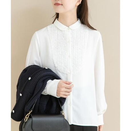 胸元のレース切替が上品なデザインブラウス。小ぶりなフリルは甘さがありつつも、どこかドレッシーで大人な印象に。程よくコンパクトなサイズ感で、ジャケットやジレのインナーとしてもおすすめです。小さな丸襟もポイントで、シンプルなボトムと合わせてもしっかり着映えるのが魅力。控えめに華やぐレース使いで、セレモニースタイルはもちろんオフィススタイルにも活躍する一着です。