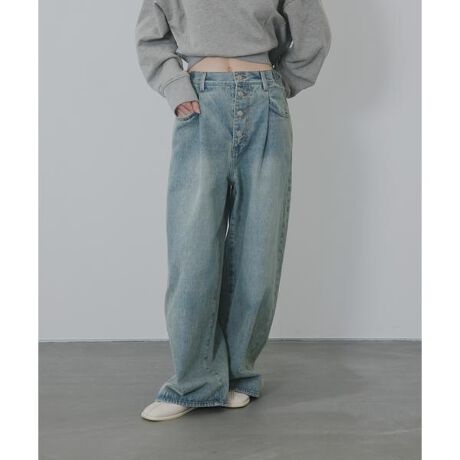 フロントに設定された釦がアクセントになったワイドデニム。ウエストはタックが入っており、腰回りがすっきりと見えるデザインに仕上げました。また、ベルト部分はウエストのサイズ調整可能な仕様になっており、身長別に選べる3サイズ展開も嬉しいポイント。裾に向かって太くなったシルエットも魅力です。