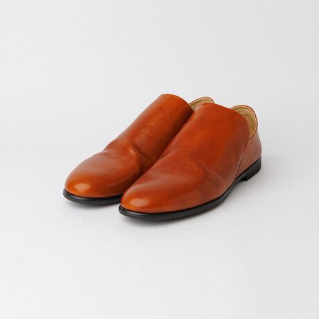フラットシューズをベースに、甲を覆うドレープが特徴のスリッポンシューズ。深いアッパーに対してくるぶし周りがしっかり見えるカッティングは、足がきれいに見える計算されたパターンが魅力。柔らかいカジュアル感と艶の上品さを表現した一足はカジュアルパンツからスラックスまで幅広く合わせていただけます。