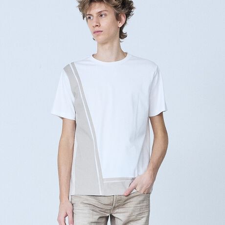 5351定番シルエットの半袖Tシャツ。 配色の切り替えの上に表地同色のグログランテープを施しました。