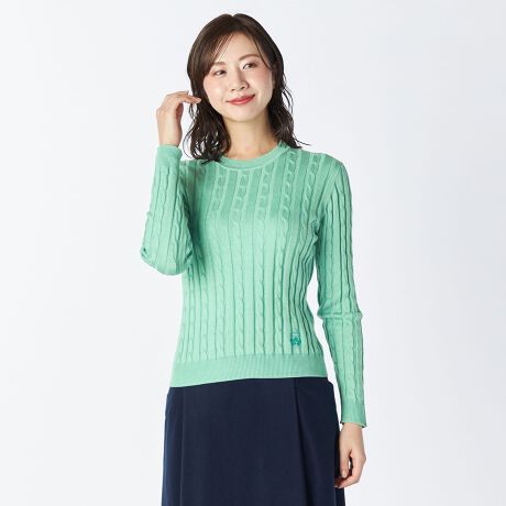 クラシカルかつエレガントなケーブル編みのクルーネックニットプルオーバー。スタイリングに差し色効果を発揮してくれるニットアイテムです。ブリティッシュトラディショナルを感じさせるエンブレム刺繍が重厚感漂うワンポイントに。ハイゲージのコットンニット素材で、ロングシーズン着回し可能です。