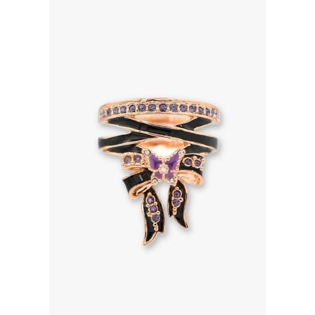 クラシカルな優美さとゴシックの神秘性が溶け合う、リボンをモチーフにしたリングです。<br>リボンの中央にはブランドの世界観を象徴する蝶を配置。<br>コルセットをイメージした編み模様がほのかな色香を漂わせます。<br>漆黒色のメタルにパープルカラーを効かせ、きらめくパープルのカットガラスを組み合わせた、甘さと毒気が共存する大胆なコントラストが魅力。<br>手元に物語性と深みを与えてくれます。<br>