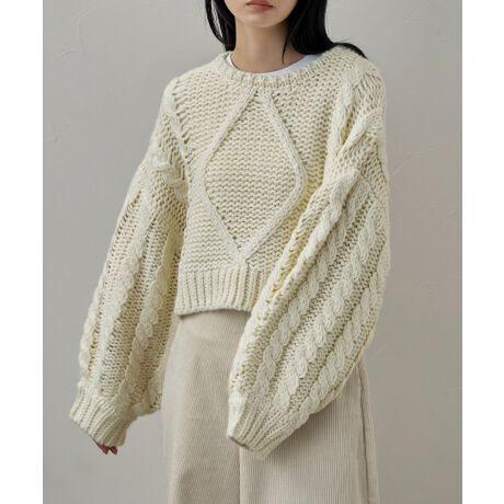 立体感のあるケーブル編みが目を惹くローゲージニットの登場です。