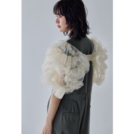 フリルが引き立つように柔らかな風合いの中に程よいハリ感を備えたチュール素材を使用。