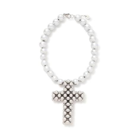 大粒のメタリックビーズを連ねた重厚感のあるデザインで、胸元に強いインパクトを与えるアイテムです。トップには大小のビーズを組み合わせて立体的に仕上げたクロスモチーフを配置。シルバートーンの輝きが、ストリートライクにもモードにも映える仕上がりです。
