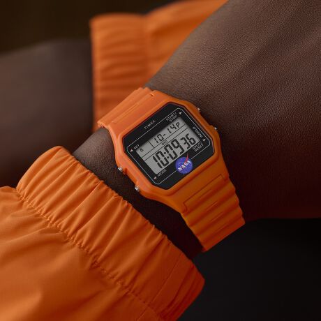 軽量なレジン製ケースとブレスレットに宇宙服を彷彿とさせる象徴的なオレンジカラーを採用。