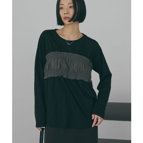 一枚でコーディネートが完成するレイヤードプルオーバー。たっぷりとギャザーを施したフェミニンなビスチェをドッキングしたデザイン性の高さが魅力です。前後差のあるヘムラインが気になる部分をカバーしてすっきりとしたシルエットを演出。シンプルなボトムに合わせるだけでサマ見えするおすすめのアイテムです。透け感[なし]