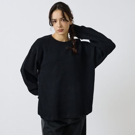 表情豊かな膨れジャガード生地は、ほどよい厚みと伸縮性があり、秋冬にぴったり。