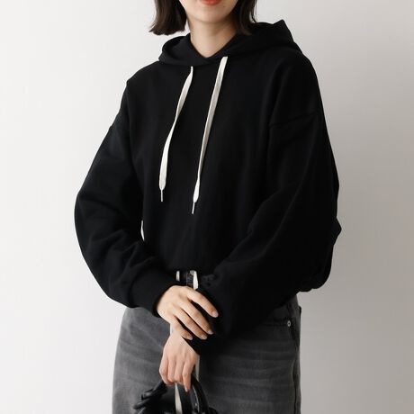 柔らかい裏毛スウェットのフーディー。単品でもさまになるようフードと裾に太めのスピンドルがあり、スタイリングのアクセントになってくれます。コンパクト見えしますが、身幅は余裕があるので着心地はとっても楽ちん。ジャケットとのレイヤードや、シンプルなアウターのインナーとして、冬のカジュアルスタイルにマストな1枚です。