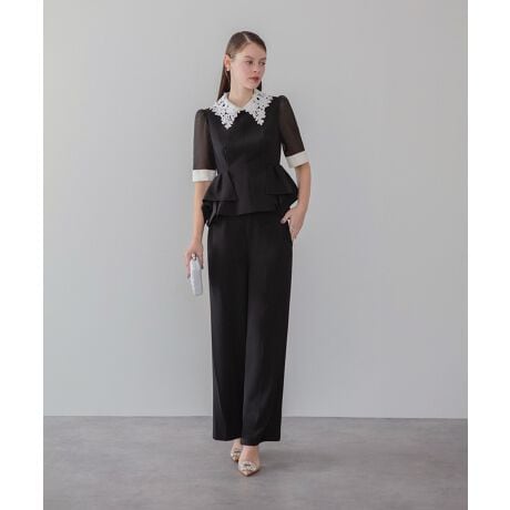レースカラーペプラムブラウスパンツセットアップドレス クラシカルな気品