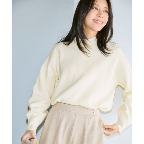 ・アクリル糸とストレッチ糸を一緒に編み込んだ素材・適度な張りと膨らみがありスッキリとした表面感・畦編みにすることで程よい厚みがあり、軽やかな着心地