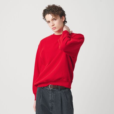 微起毛感のあるピーチスキン加工を施し、柔らかな表情に仕上げたクルーネックスウェット。