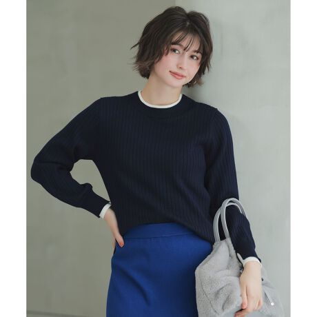 ・すっきりとしたリブ素材のプルオーバー・レイヤードトップスの様な襟と袖の配色デザインがポイント・裾スリットと前後差のある着丈でトップスアウトでもサマ見えが叶う・ほどよいコンパクトな身頃とふんわりした袖が上品