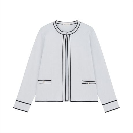 配色パイピングが華やかな印象を与えてくれるクルーネックのノーカラーニットジャケット。