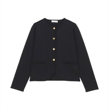 衿や袖・裾回りの縁取りに金ボタンが上品な印象のニットジャケット。