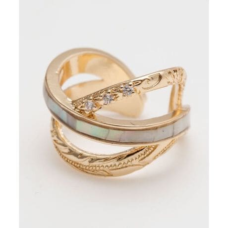[型番:46PZ6107-2025]シェル風樹脂がきらめく2WAYイヤーカフ。耳にも指にも使えるデザインで、光を受けてリゾートムードを演出。ハワイアンジュエリー調の刻印が上品さをプラスし、さりげない存在感を放ちます。