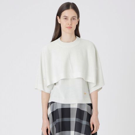 [型番:55N33605__]◆レイヤードデザインが特徴的なケープ付きニット【Design】半袖ニットとケープがセットになったデザインニットアイテムです。ウール素材にラメをプレーティングした華やかな印象の一枚です。インナーのニットはロゴプレートとサイドスリットがポイントです。セットでの着用はもちろん、それぞれ単体でもご使用いただけます。