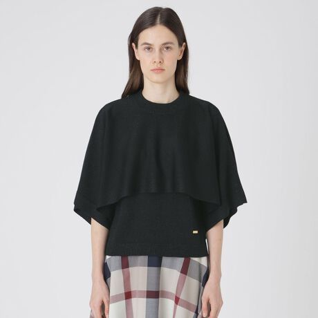[型番:55N33605__]◆レイヤードデザインが特徴的なケープ付きニット【Design】半袖ニットとケープがセットになったデザインニットアイテムです。ウール素材にラメをプレーティングした華やかな印象の一枚です。インナーのニットはロゴプレートとサイドスリットがポイントです。セットでの着用はもちろん、それぞれ単体でもご使用いただけます。