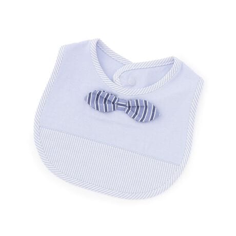 蝶ネクタイを添えたきちんと感があるデザインのスタイです。ストライプ柄とさわやかなカラーリングで、上品な雰囲気に仕上げました。バックネックにスナップボタンを配しており、つけ外しもラクラク。本体部分にはオーガニックコットンを使用しています。