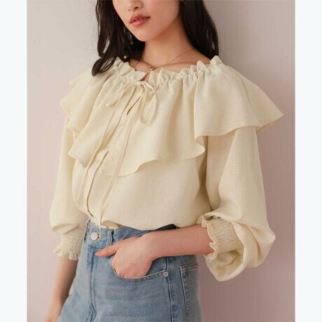 ・春先に大活躍するブラウス・ストライプ見えするサッカー系素材が可愛い・襟がゴム仕様なのでマルチウェイで着用して頂けます・シンプルなボトムスでも着映えさせてくれるアイテムです[型番:AHXN2330]
