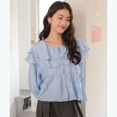 ・ひらっとしたラッフルフリルが可愛いブラウス・程よい透け感のある合繊素材・ウエストのギャザーが女性らしい雰囲気にしてくれます・1枚で着映えするアイテム[型番:AHXN2385]
