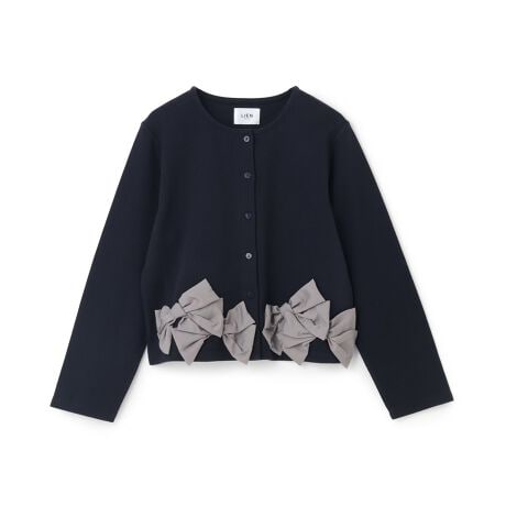 裾にほどこされたボリューミーなリボンが目を引くカーディガンです。