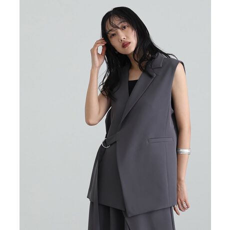 ジレのアシンメトリーなラインが、シンプルながら印象に残る佇まいへと導きます。