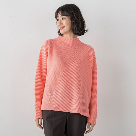 首元はすっきり見えるモックネック、シルエットは少しゆるめで大人の抜け感をプラス。