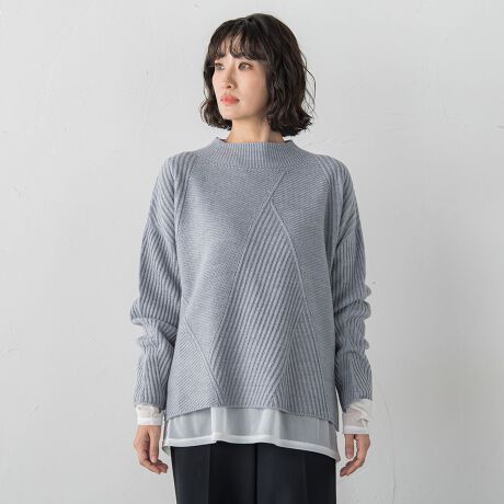 首元はすっきり見えるモックネック、シルエットは少しゆるめで大人の抜け感をプラス。