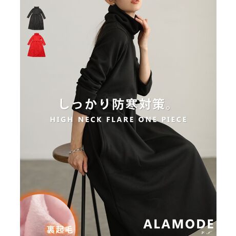 裏起毛が冬の冷えを包み込むワンピースは、ハイネックで首までしっかり暖かいのが魅力。高めの切替位置から広がるフレアシルエットが自然に脚長効果を生み、大人の冬スタイルを品よく仕上げてくれます☆