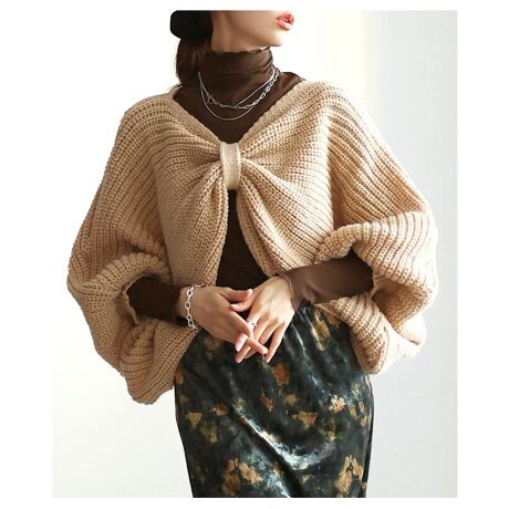 ざっくり編みのローゲージニットボレロは、まるでリボンをまとったような愛らしいデザインに思わずときめく一枚。ドルマン風のふんわり袖が二の腕を優しくカバーし、いつものコーデにプラスするだけで華やぎが生まれます!