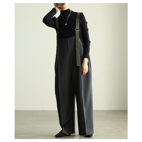 【パンツ】 サロペット ワイド ロング センタープレス タック レイヤード カーキ チャコール 通年