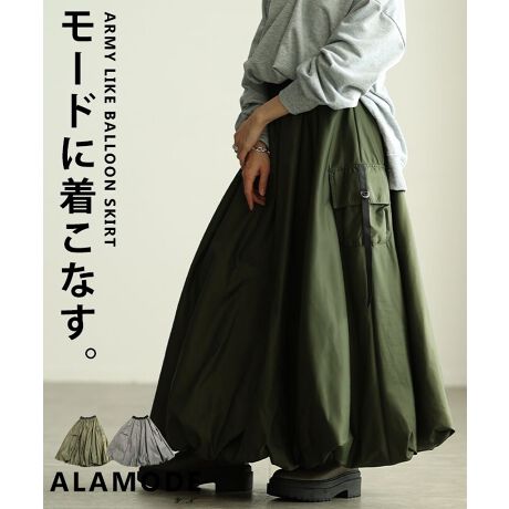 ミリタリー風のアーミーな雰囲気が魅力のバルーンスカート。ふんわりシルエットで気になる腰まわりを自然にカバーし、ウエストゴムでラクな穿き心地。コーデに取り入れるだけでスタイルにこなれ感をプラスします。