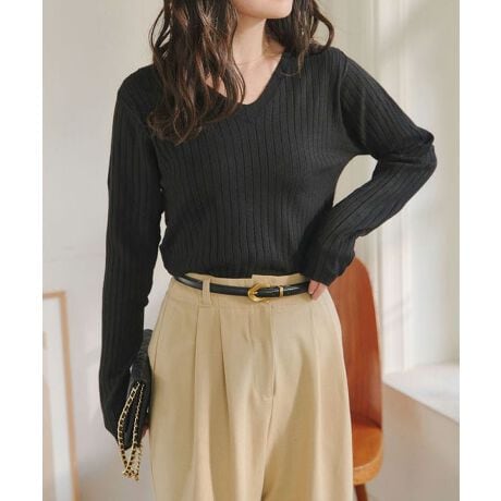 もっちりとした柔らかな肌ざわりが心地よい、太リブ×Vネックの長袖ニットトップス。