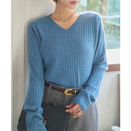 もっちりとした柔らかな肌ざわりが心地よい、太リブ×Vネックの長袖ニットトップス。